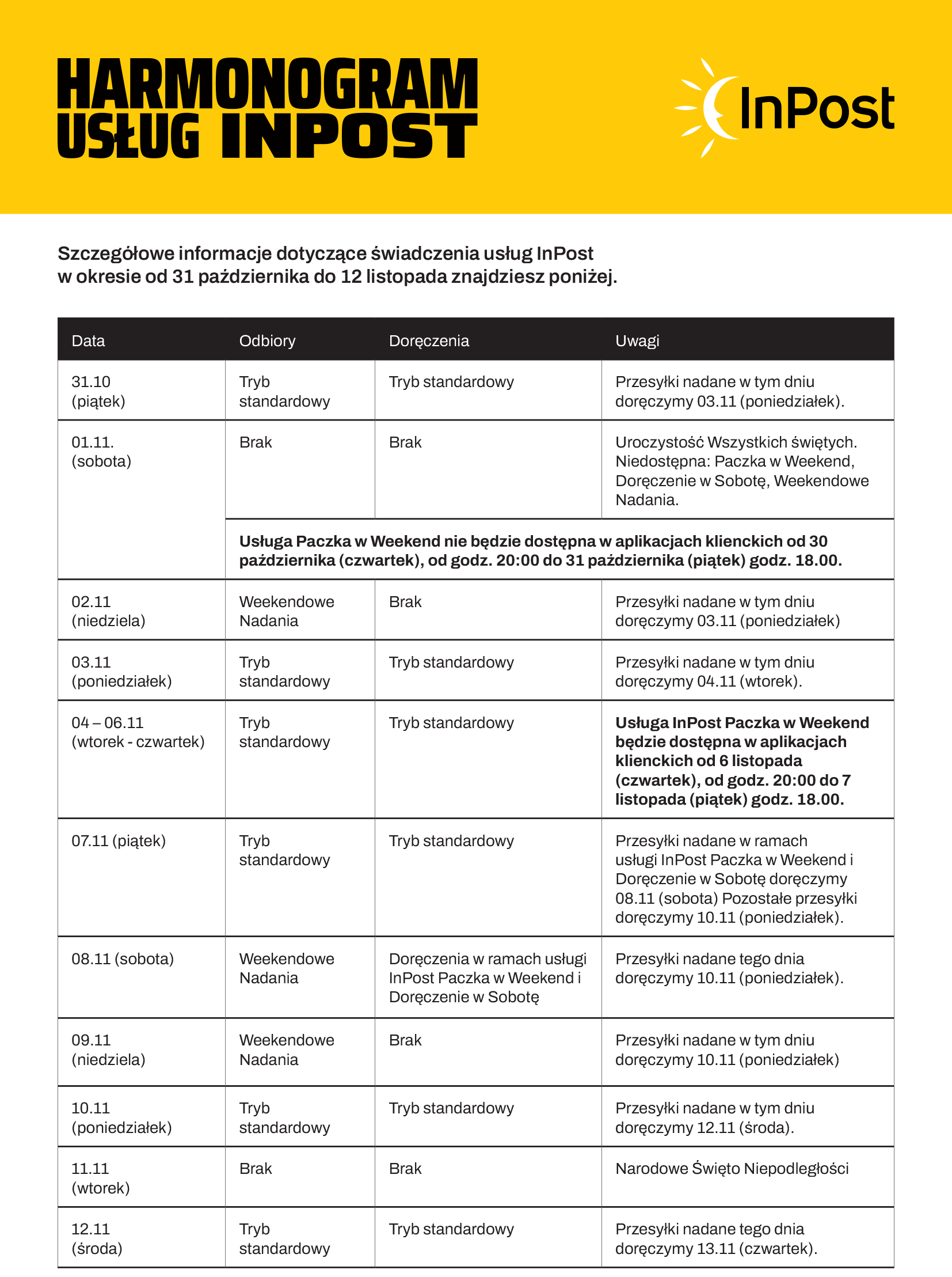 Detailed information regarding InPost services between 31 October and 12 November can be found in the table below.
